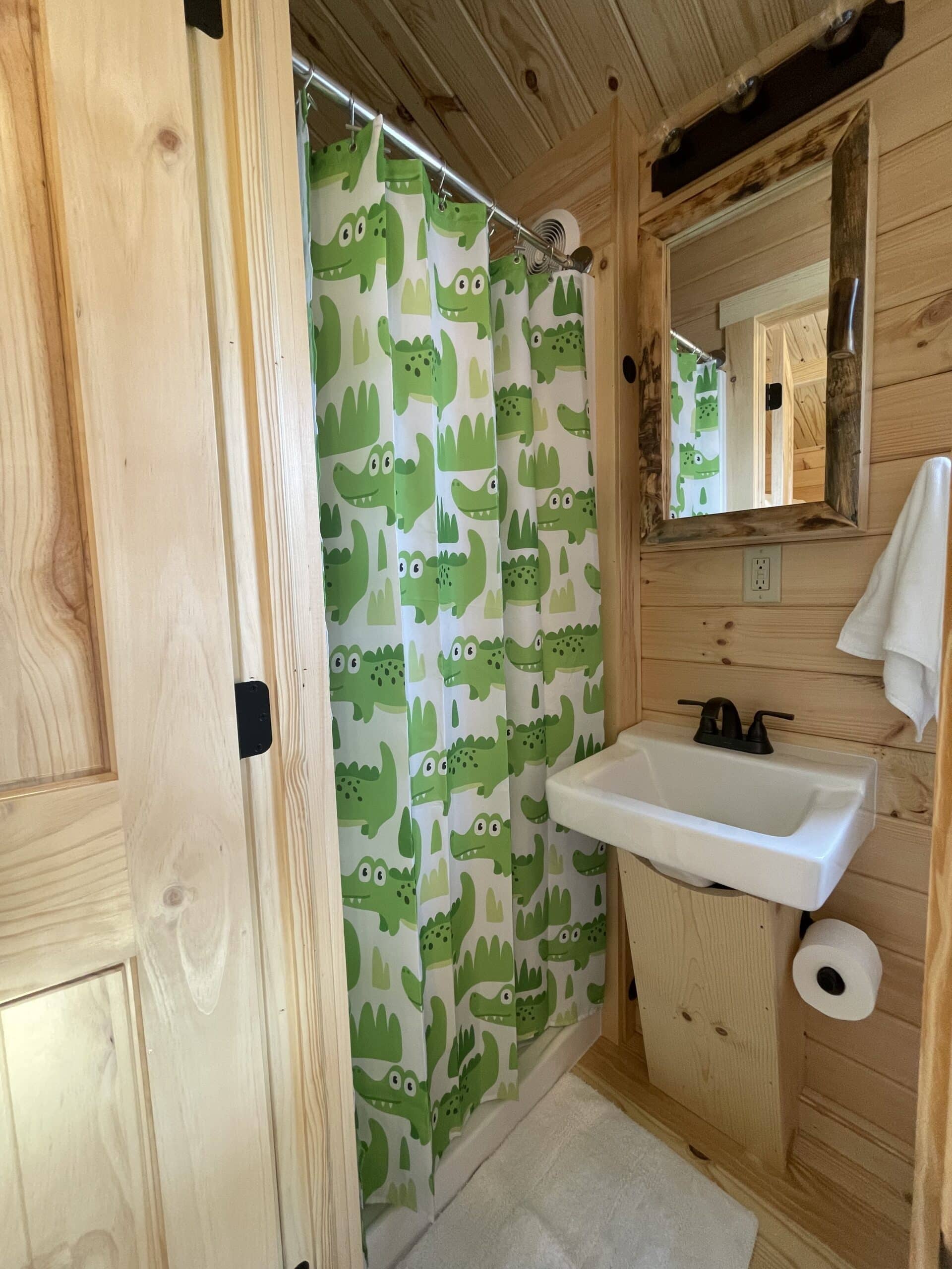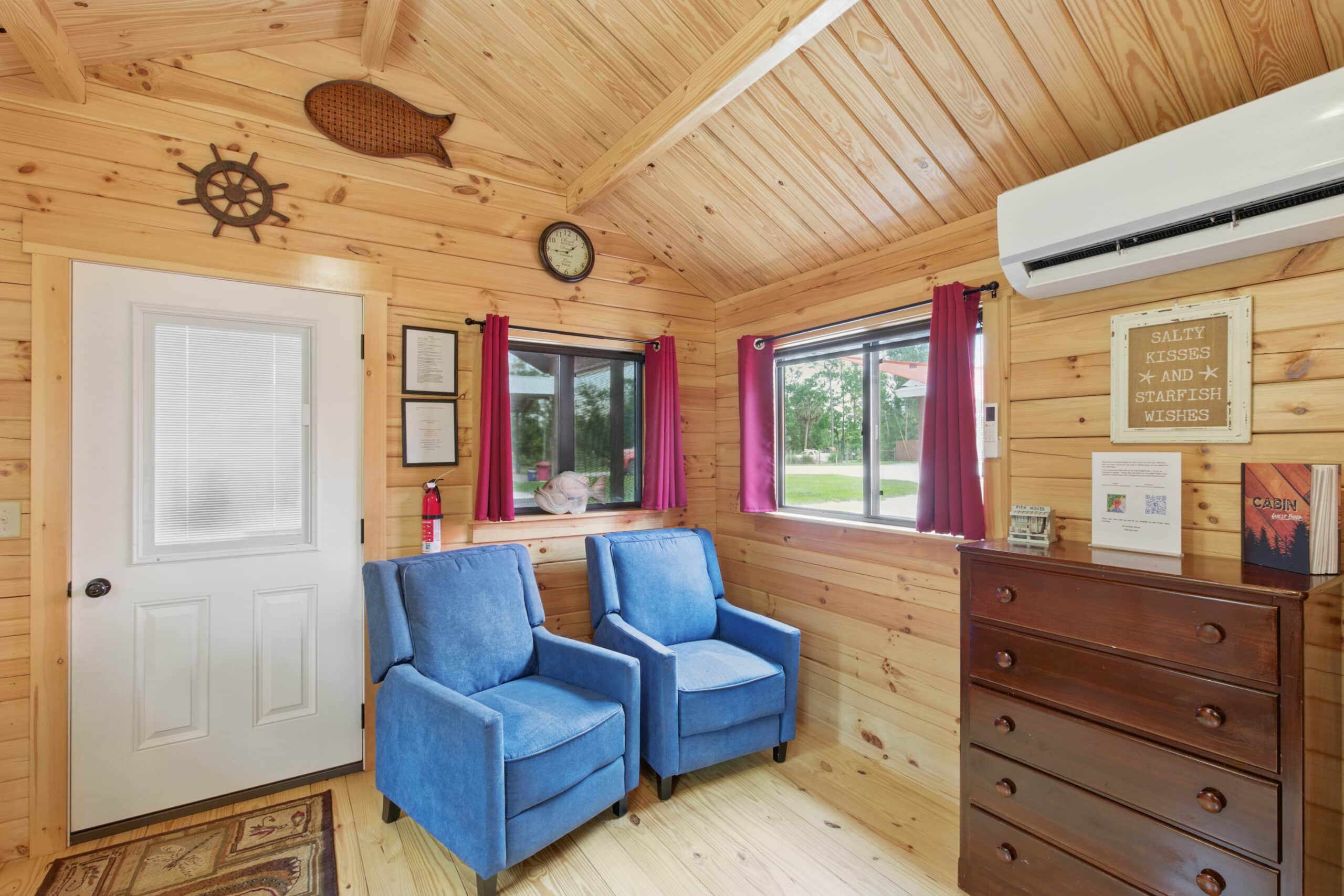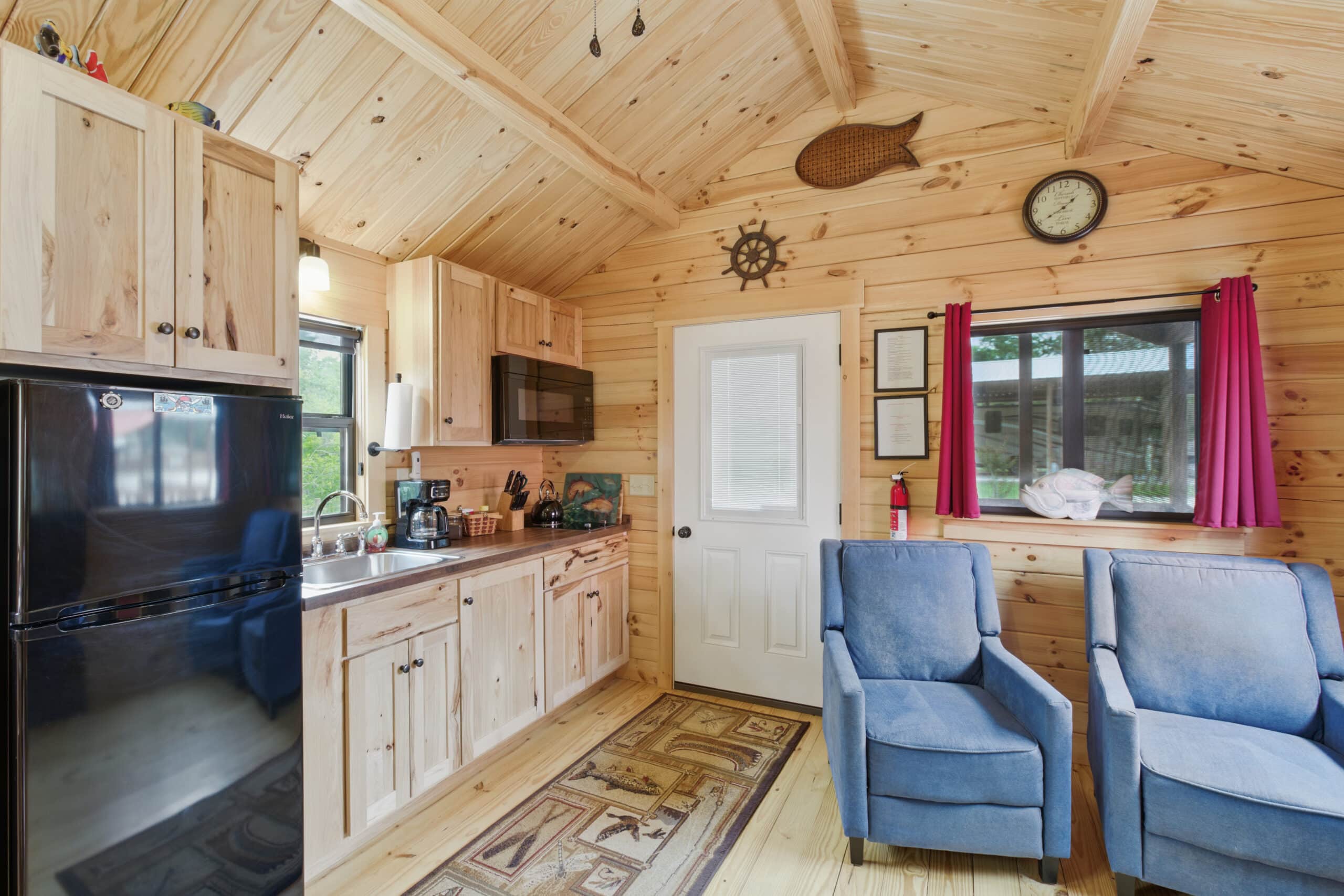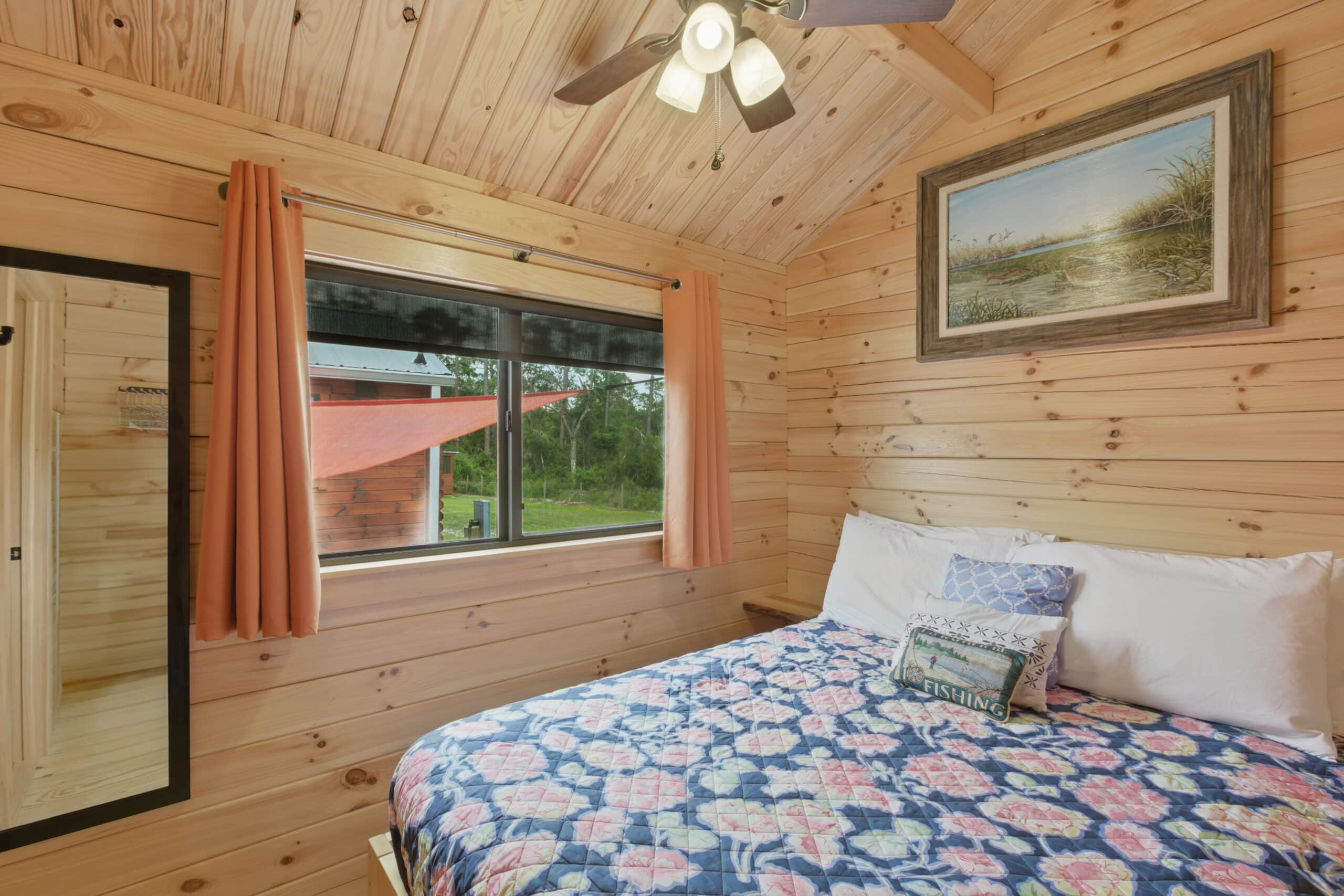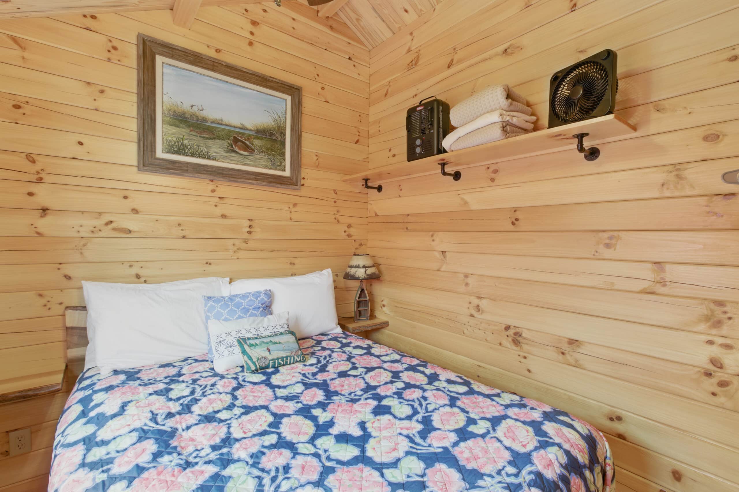 Step into the Fisherman’s Cabin, designed for comfort after a long day on the water. This cabin sleeps up to 4 guests and features a queen bed and a pull-out futon, making it perfect for couples or small families. Enjoy a spacious front porch where you can relax with your morning coffee or wind down after sunset. Inside, you’ll find charming wood finishes, a fully equipped kitchen, private bath, smart TV, and high-speed Wi-Fi to keep you connected when needed.