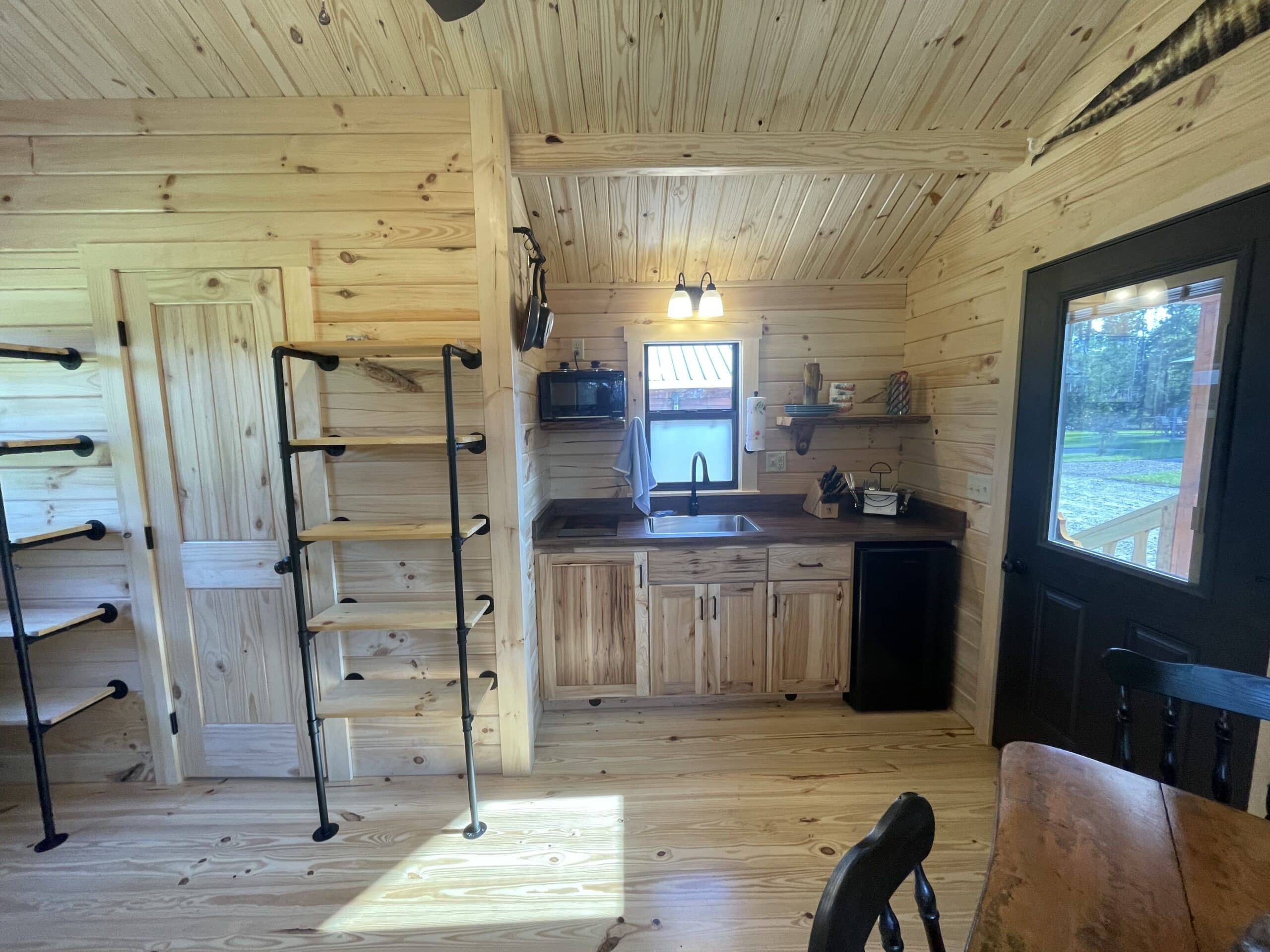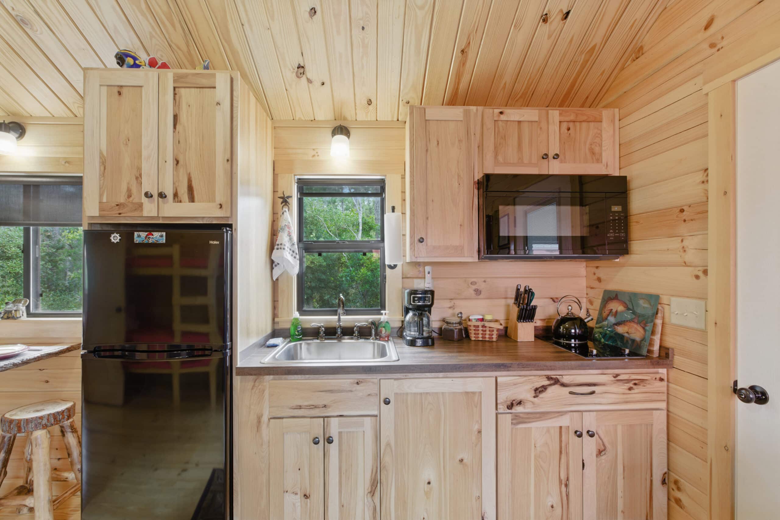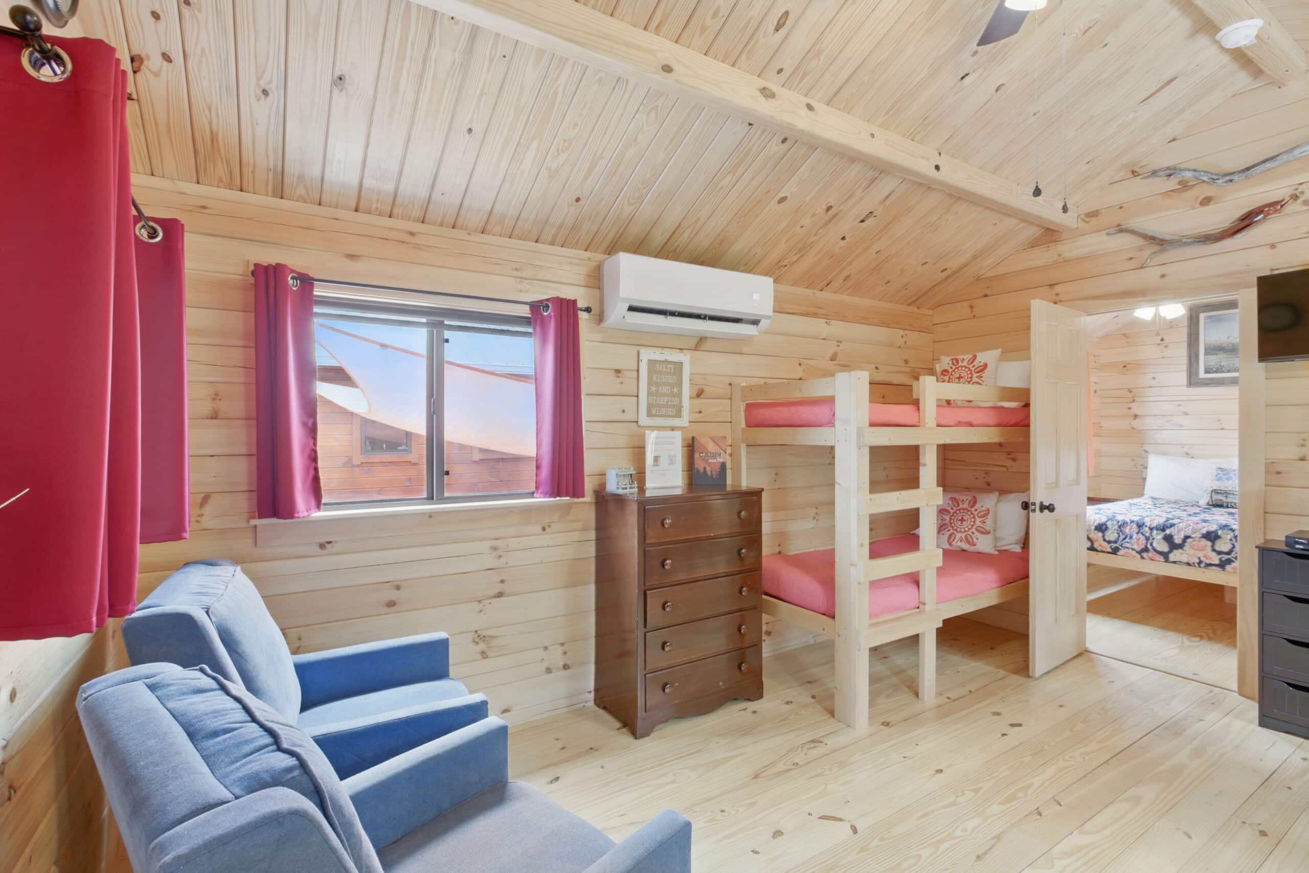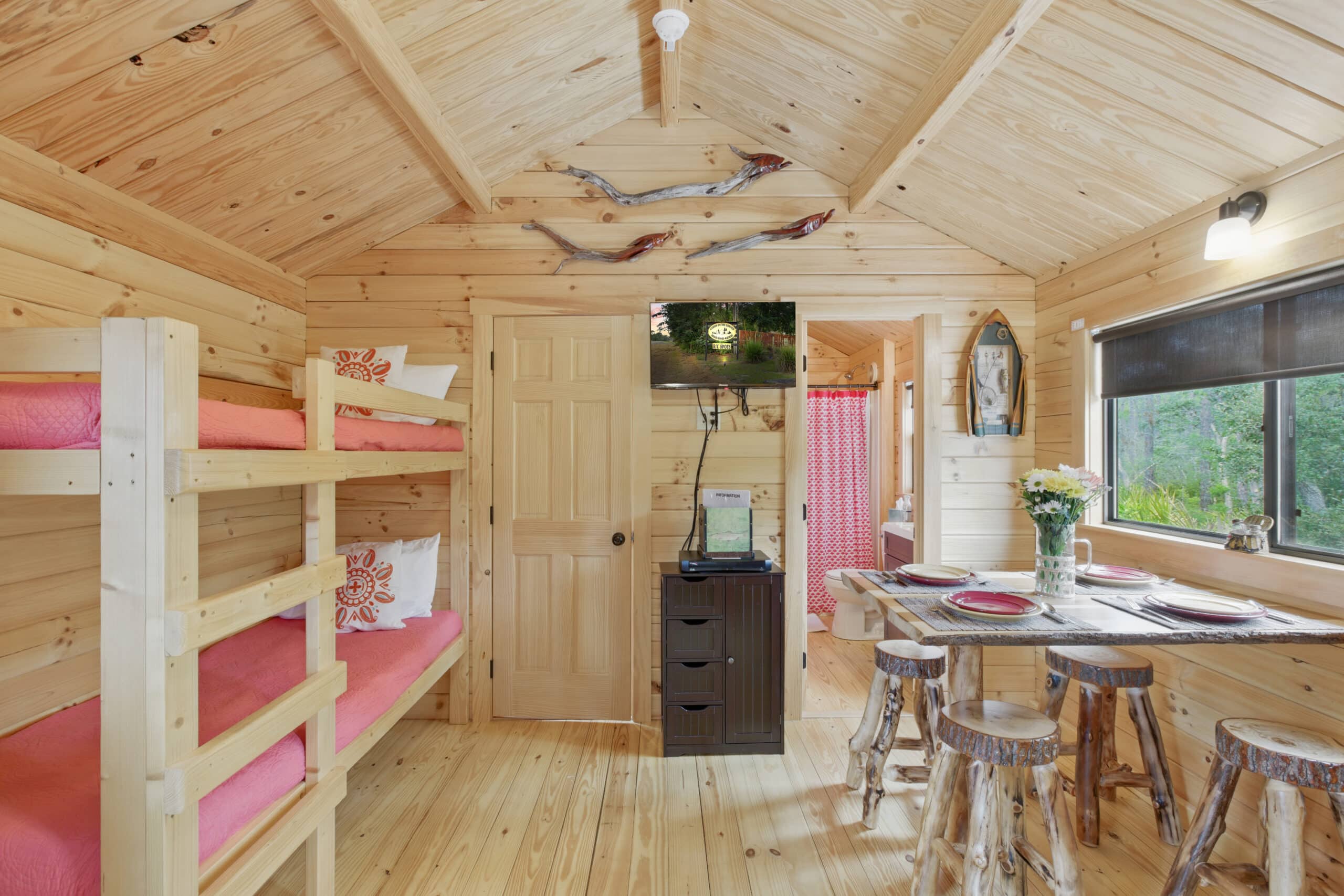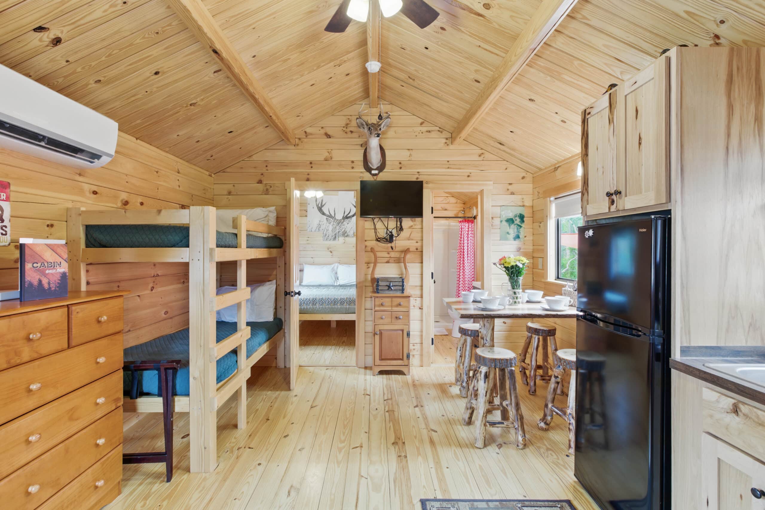 Step into the Fisherman’s Cabin, designed for comfort after a long day on the water. This cabin sleeps up to 4 guests and features a queen bed and a set of bunk beds, making it perfect for couples or small families. Enjoy a spacious front porch where you can relax with your morning coffee or wind down after sunset. Inside, you’ll find charming wood finishes, a fully equipped kitchen, private bath, smart TV, and high-speed Wi-Fi to keep you connected