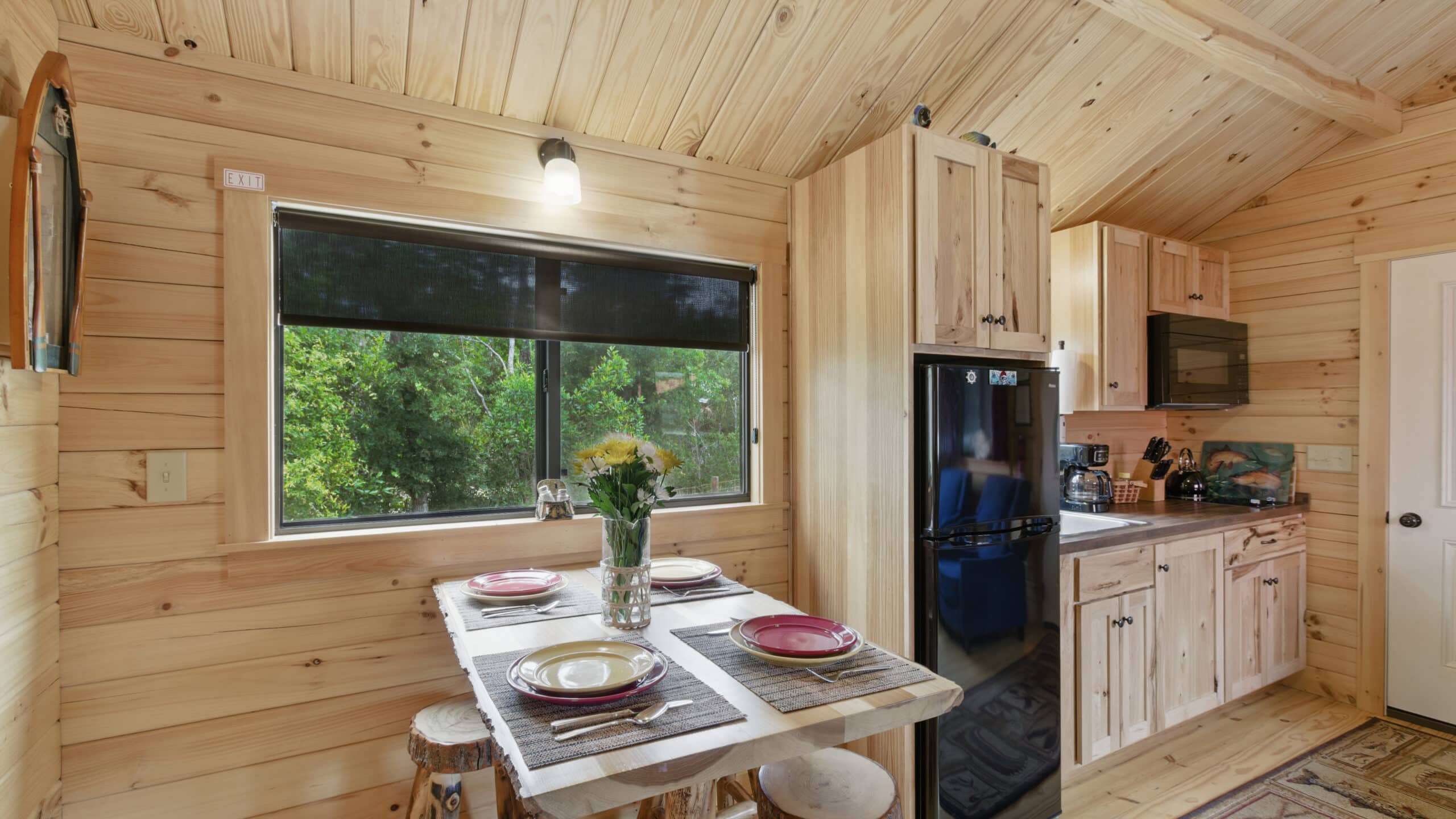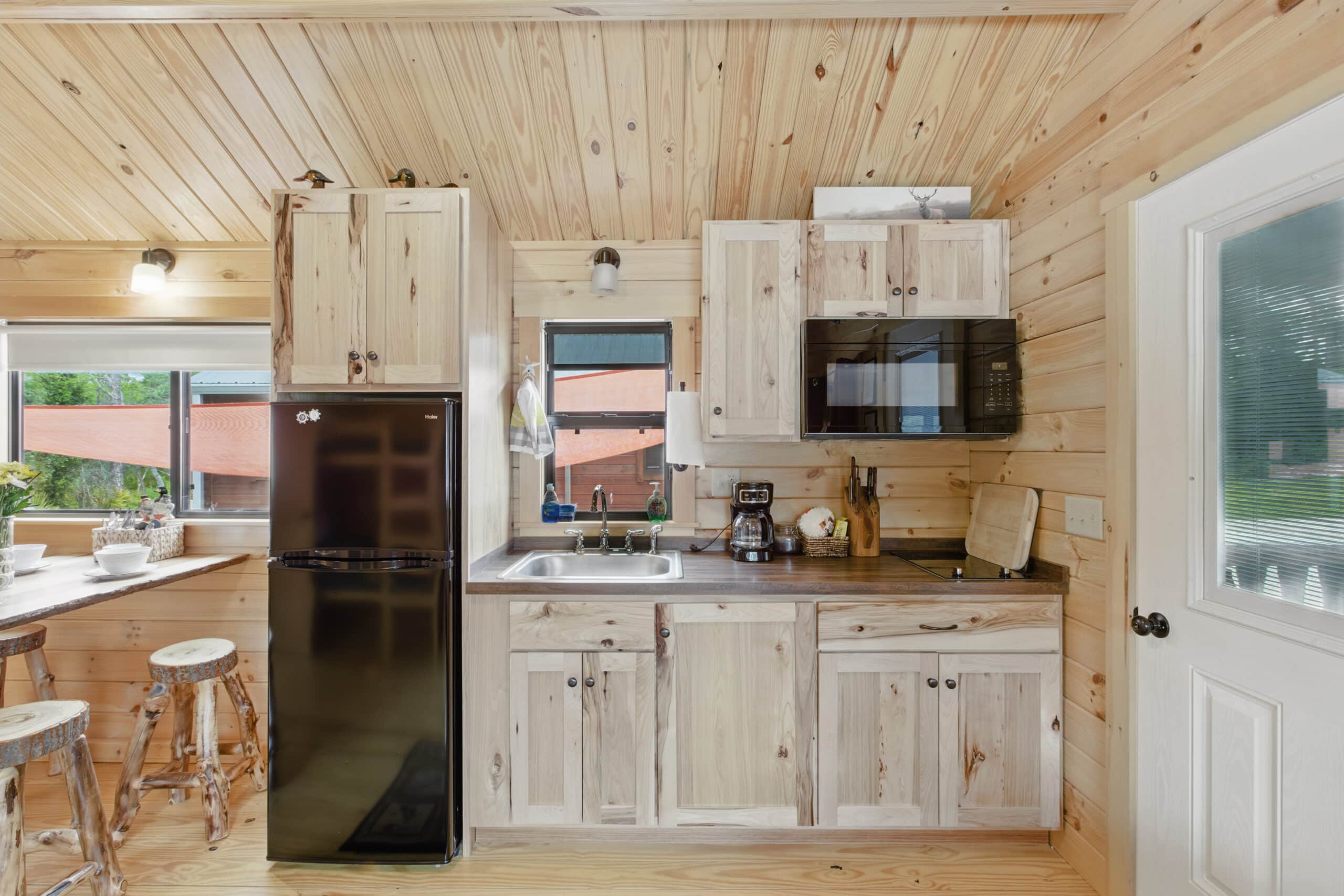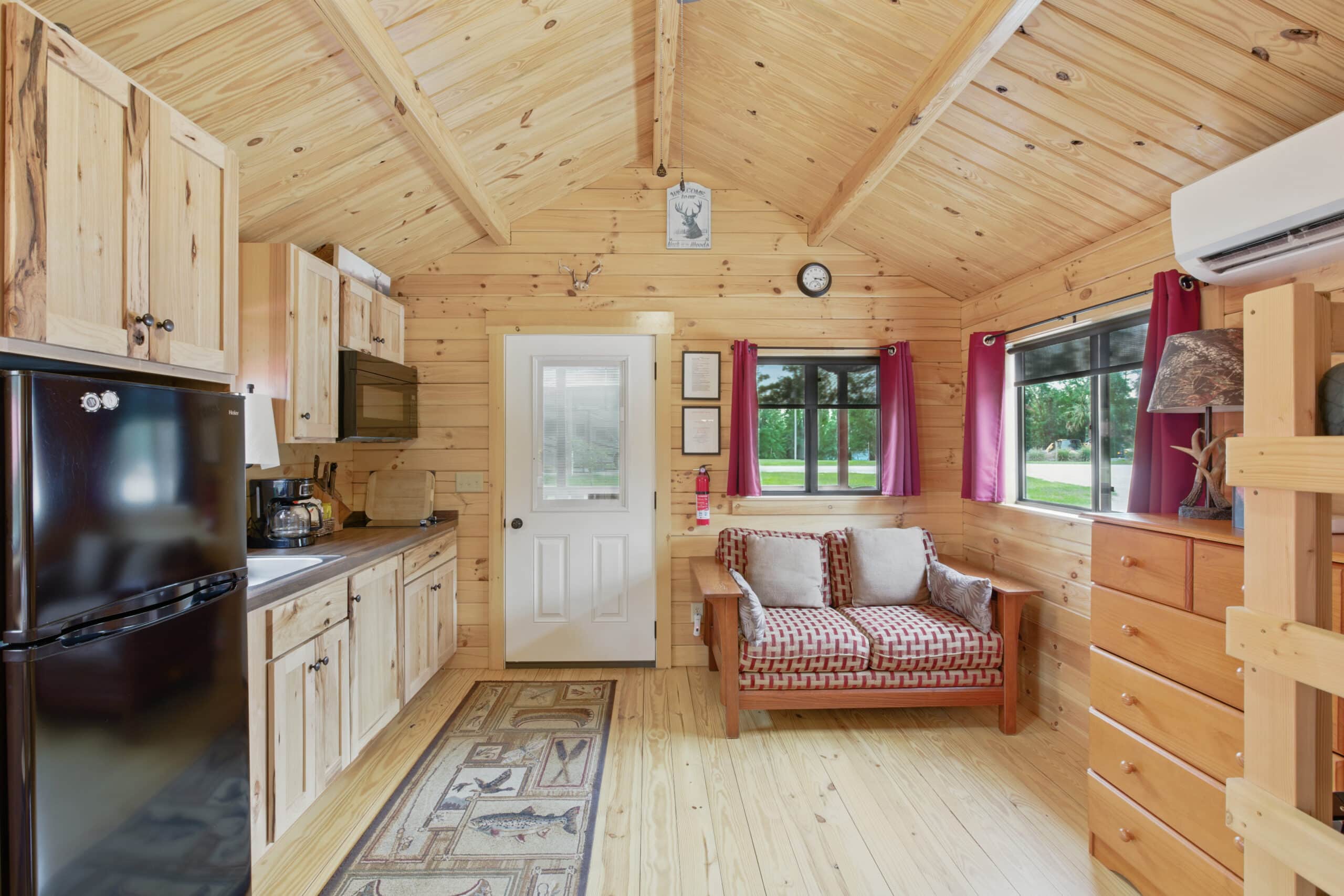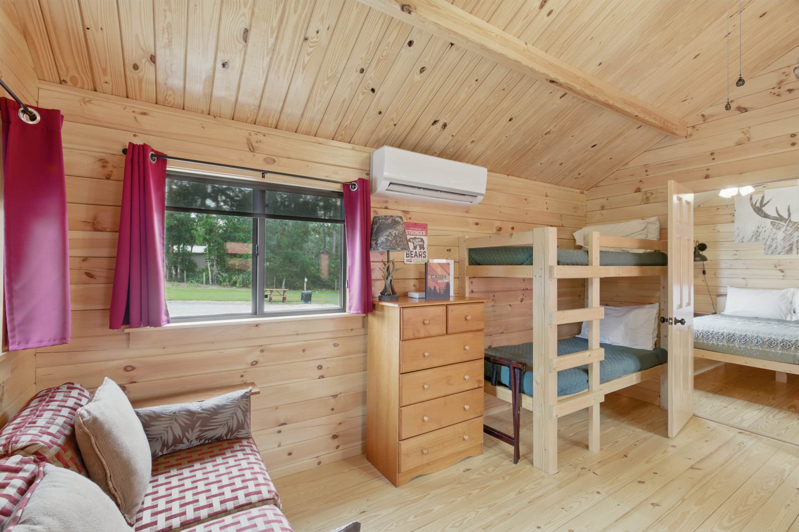 The Hunter’s Cabin offers the same great amenities with a slightly different layout, ideal for outdoor enthusiasts and weekend adventurers. It also accommodates 2–4 guests with a queen bed and set of bunkbeds in each cabin and includes all the comforts of home—from fresh linens and towels to climate control and hot showers. Like all our cabins, it features a covered porch where you can sit back and enjoy the peaceful sounds of Steinhatchee’s natural surroundings.